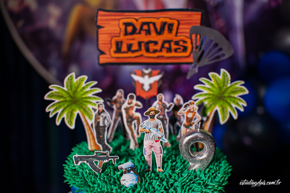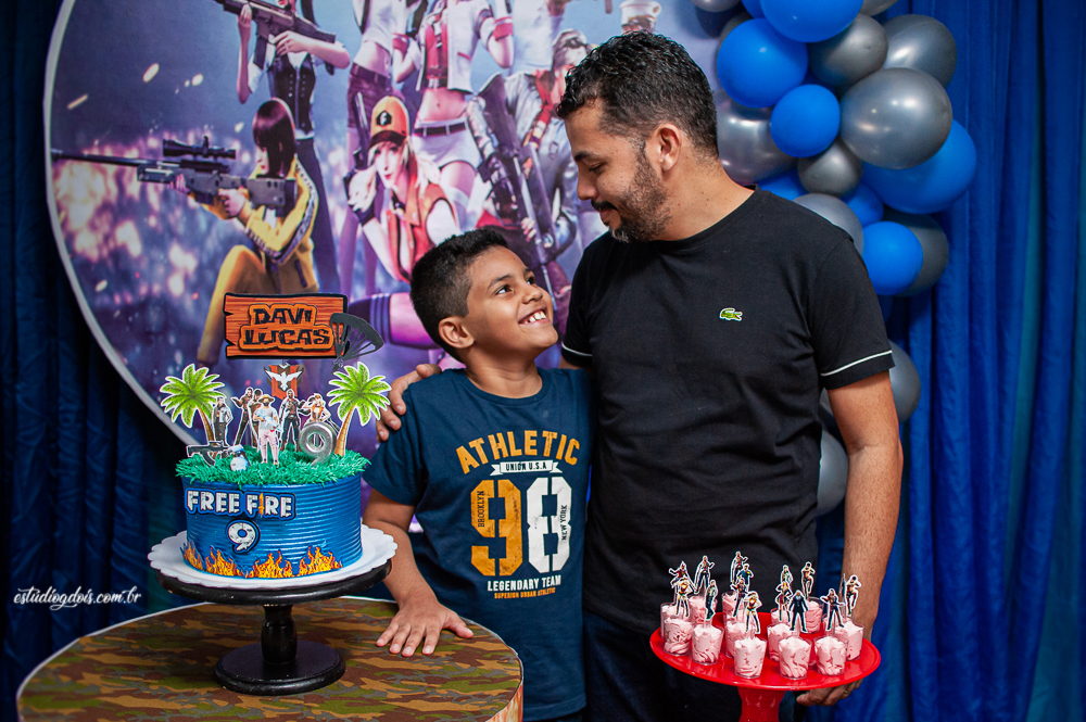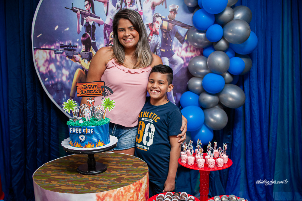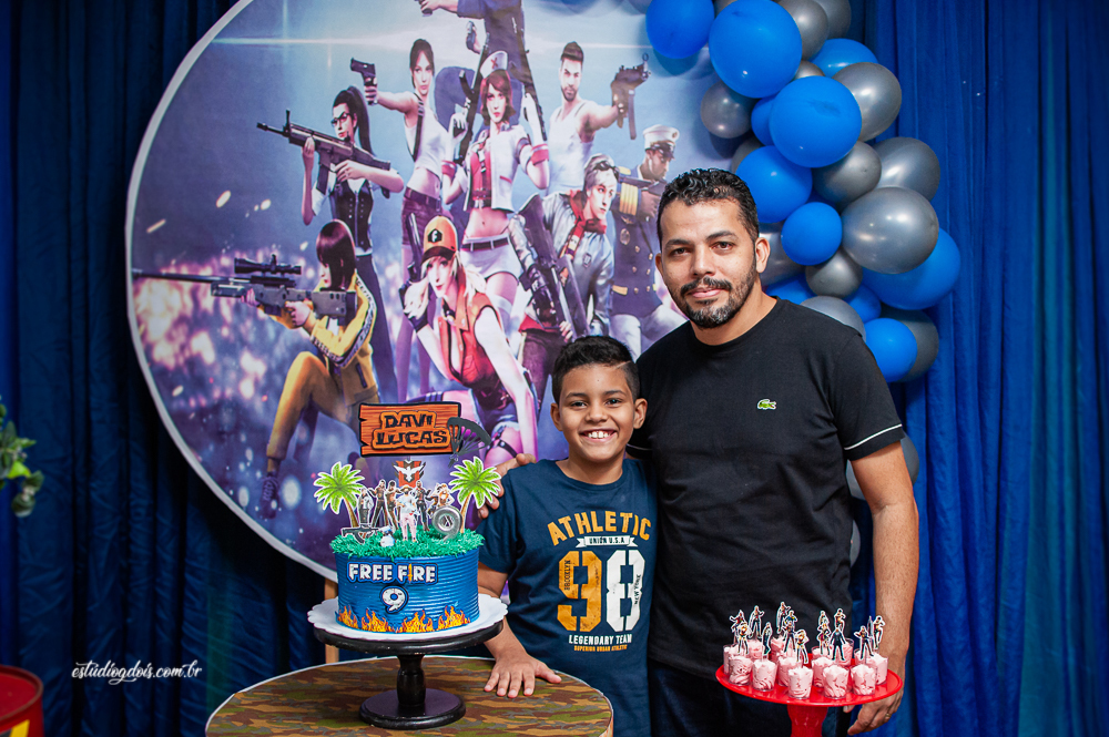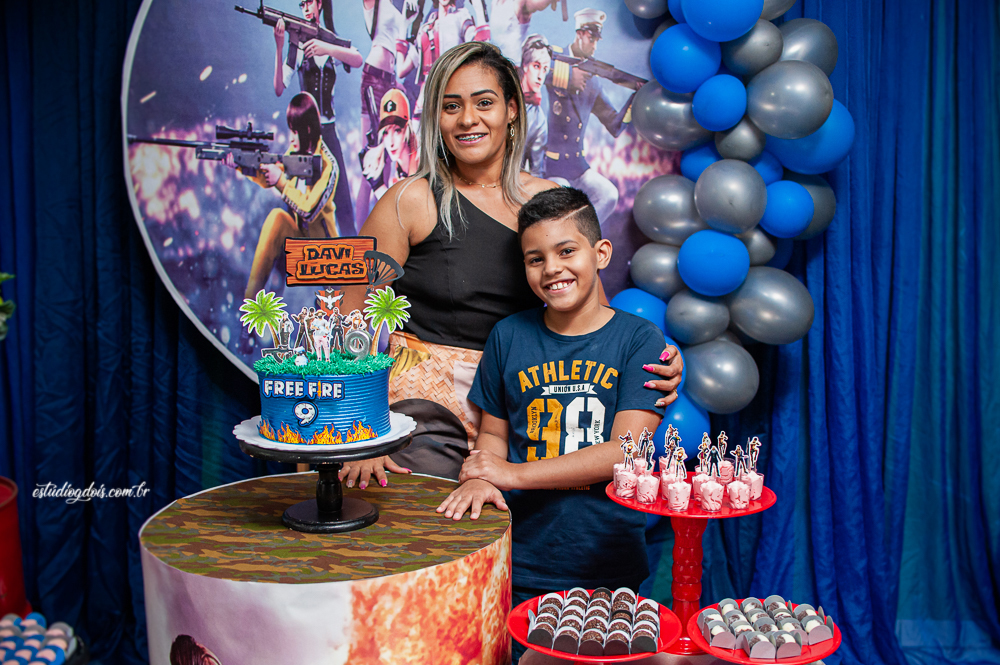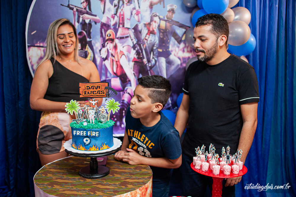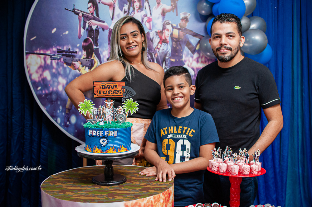 Além dos doces, salgadinhos e bolo, a decoração incrível do tema FREE FIRE ficou por conta da @chocomfestas que é parceira do Estúdio GDOIS e Mãe do Davi.