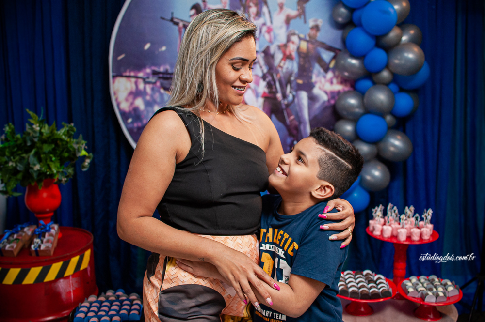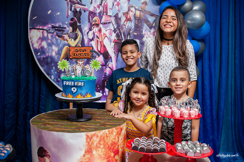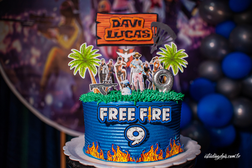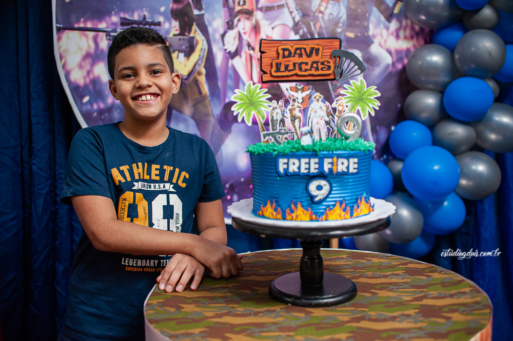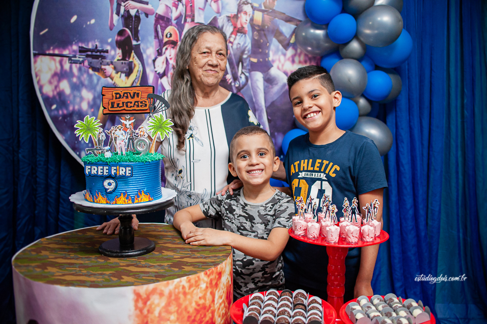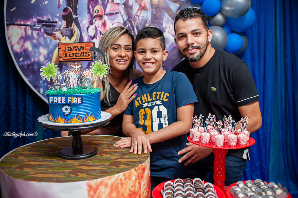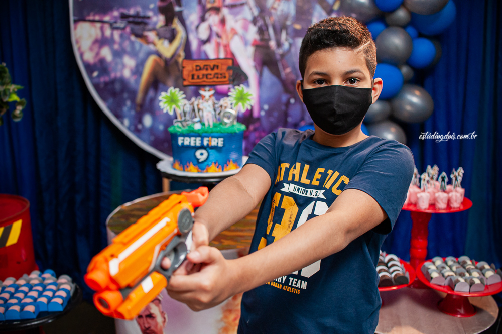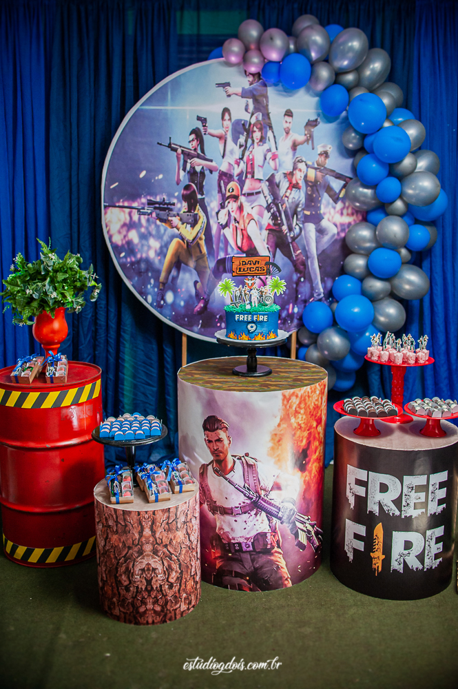 Além dos doces, salgadinhos e bolo, a decoração incrível do tema FREE FIRE ficou por conta da @chocomfestas que é parceira do Estúdio GDOIS e Mãe do Davi.